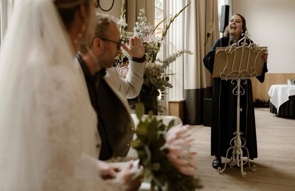 ‘Babs heeft een prachtige, complete toespraak gemaakt. Ons verhaal heeft ze zo mooi opgeschreven met ruimte voor een lach maar ook voor een traan. Het creatieve door muziek nummers toe te voegen in de toespraak was echt zo mooi en paste precies bij onze liefde voor muziek. De sfeer die zij creëerde was heel vrij en ongedwongen waardoor onze gasten zich snel op hun gemak voelden. Zij maakte onze dag echt perfect. Wij kijken met ongelooflijk veel plezier terug naar onze dag.’